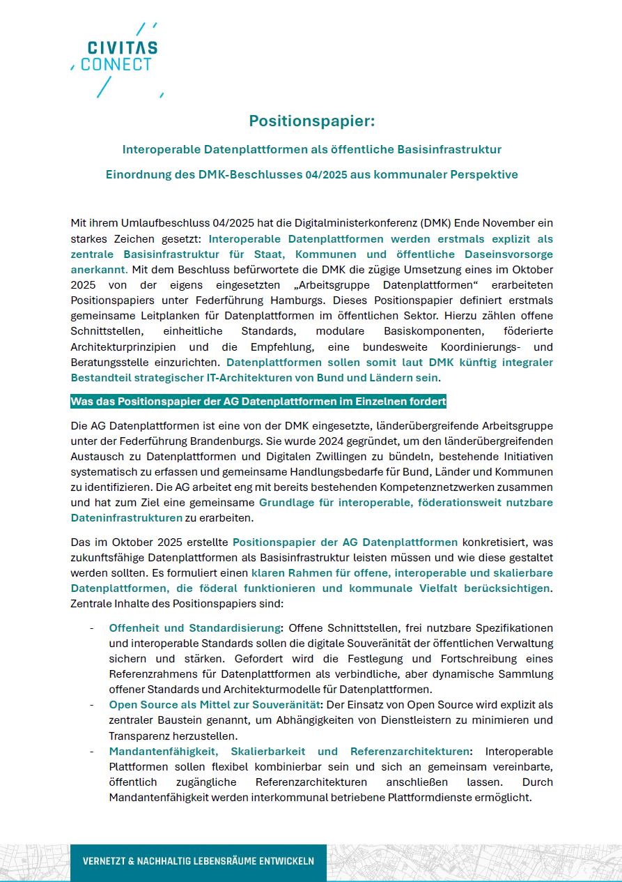 Positionspapier: Interoperable Datenplattformen als öffentliche Basisinfrastruktur Einordnung des DMK-Beschlusses 04/2025 aus kommunaler Perspektive